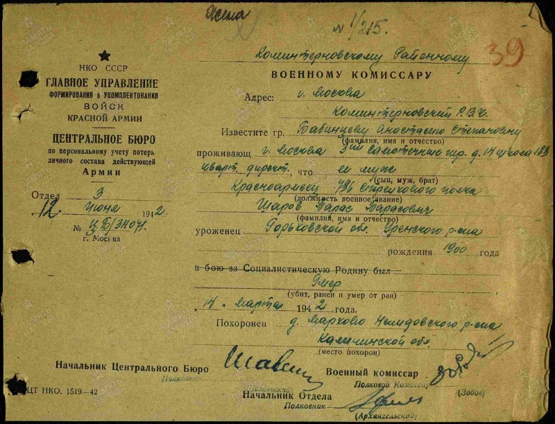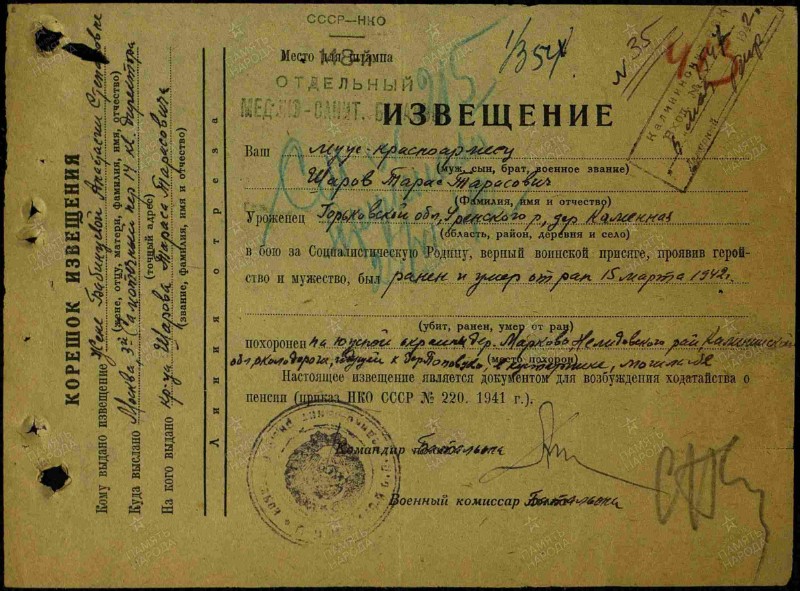 Шаров Тарас Тарасович (1900-14.03.1942) ![]() Документ, уточняющий потери |